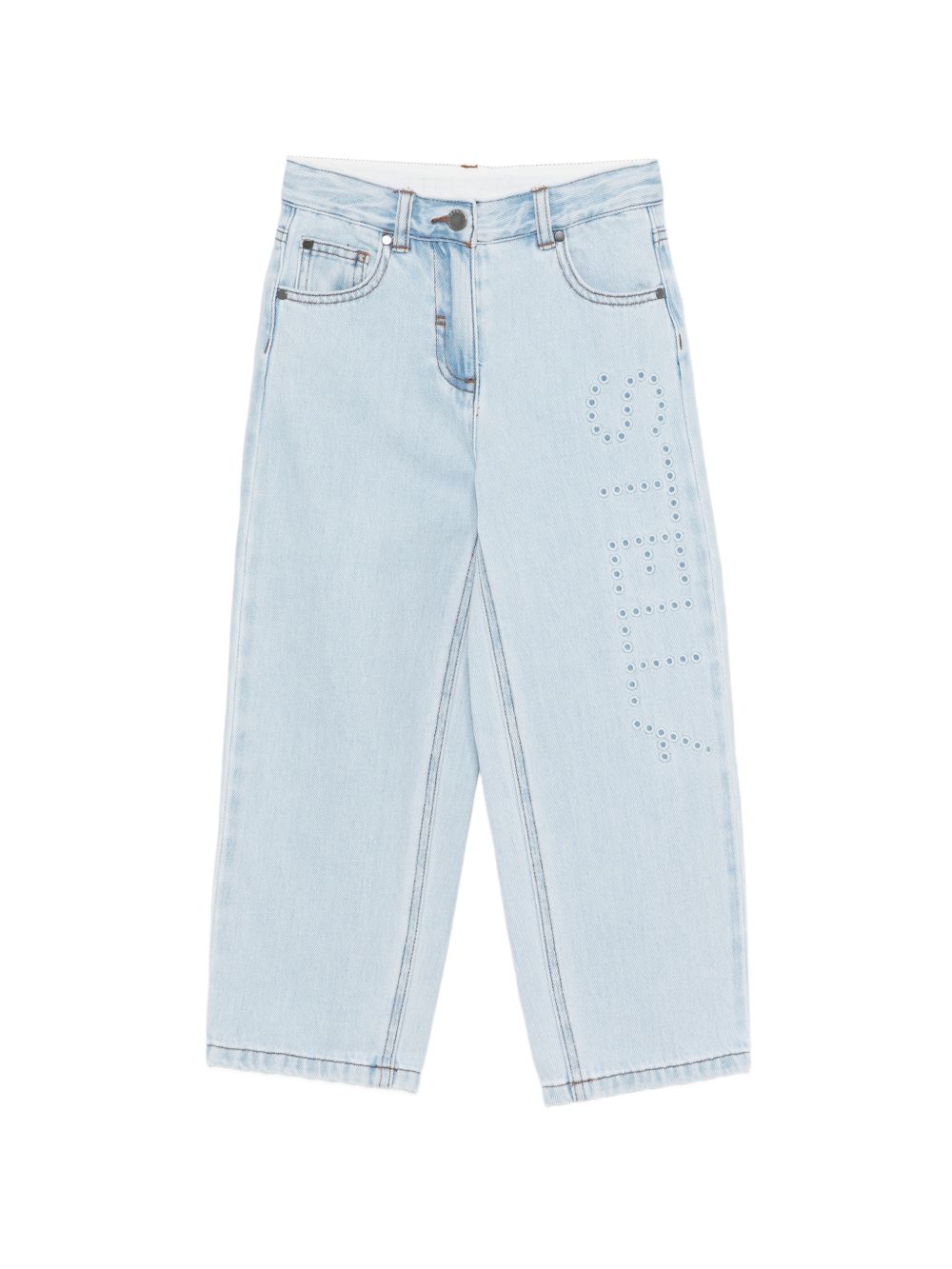 Pantalone in denim ricamati, azzurro chiaro, design a cinque tasche, passanti per cintura.