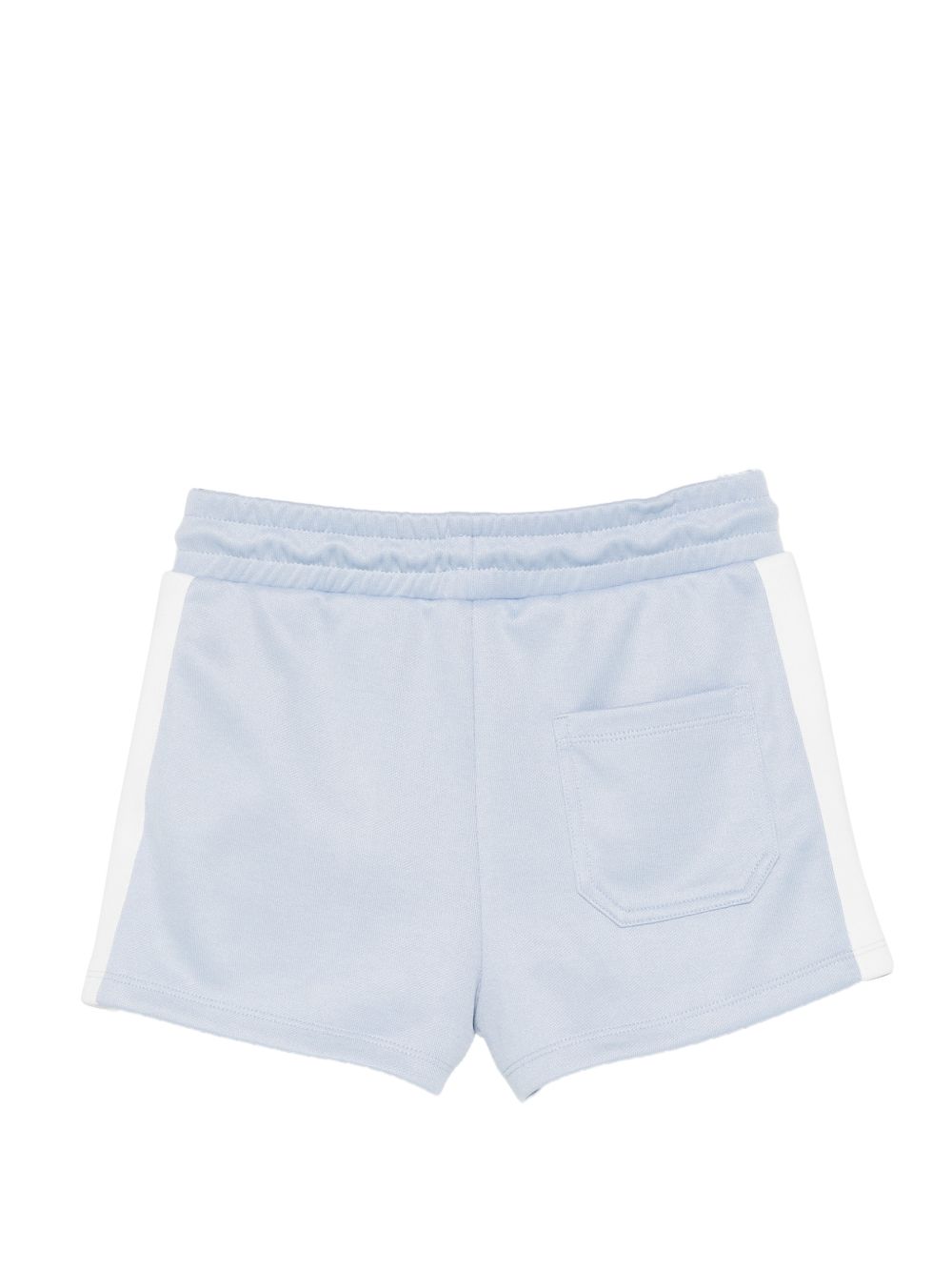 Shorts azzurro, dettaglio logo, vita con coulisse, dettaglio laterale a righe, tasca posteriore sagomata.