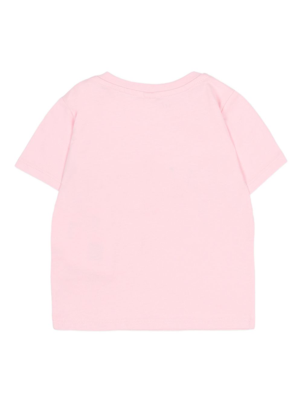 manica corta rosa con motivo a coccinella, scollo rotondo, chiusura con bottone automatico sulla spalla