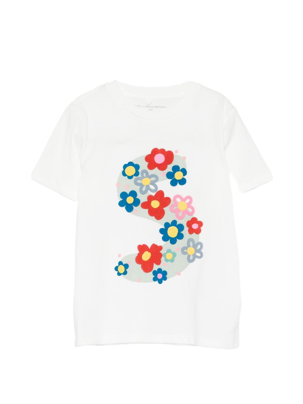 T-shirt con stampa grafica fiori, girocollo, bianco, maniche corte.