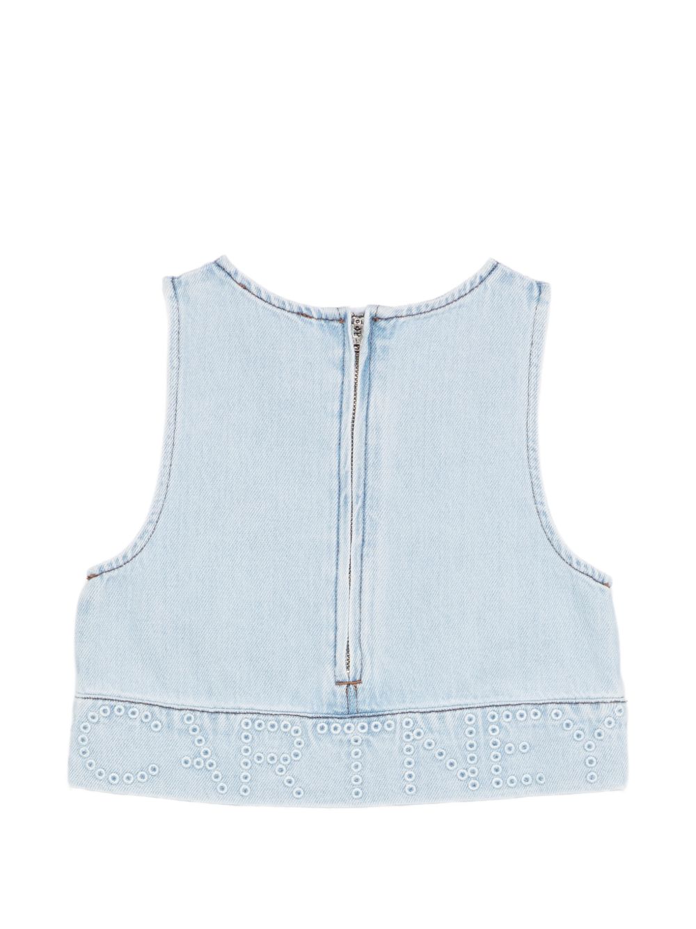 Top con dettagli ricamati, azzurro in denim, senza maniche, scollo rotondo, chiusura con zip posteriore