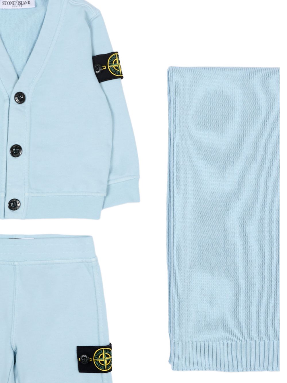 Set azzurro chiaro, scollo a V, cardigan con chiusura con bottoni, pantalone con elastico in vita e scialle in cotone