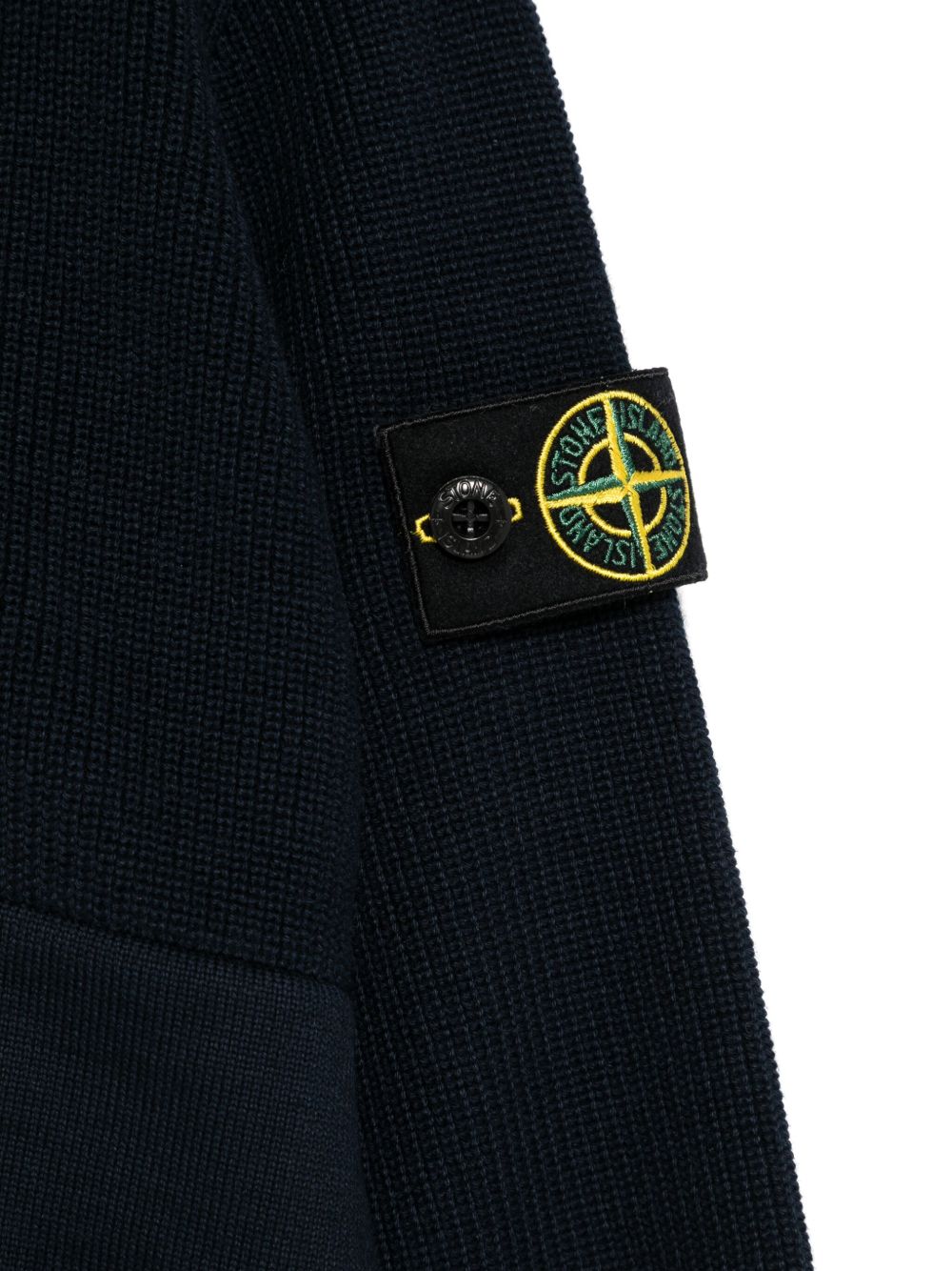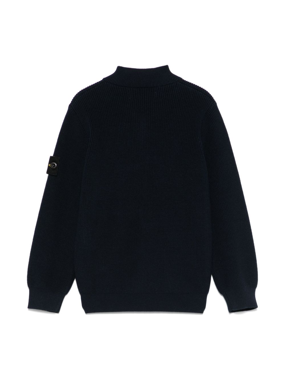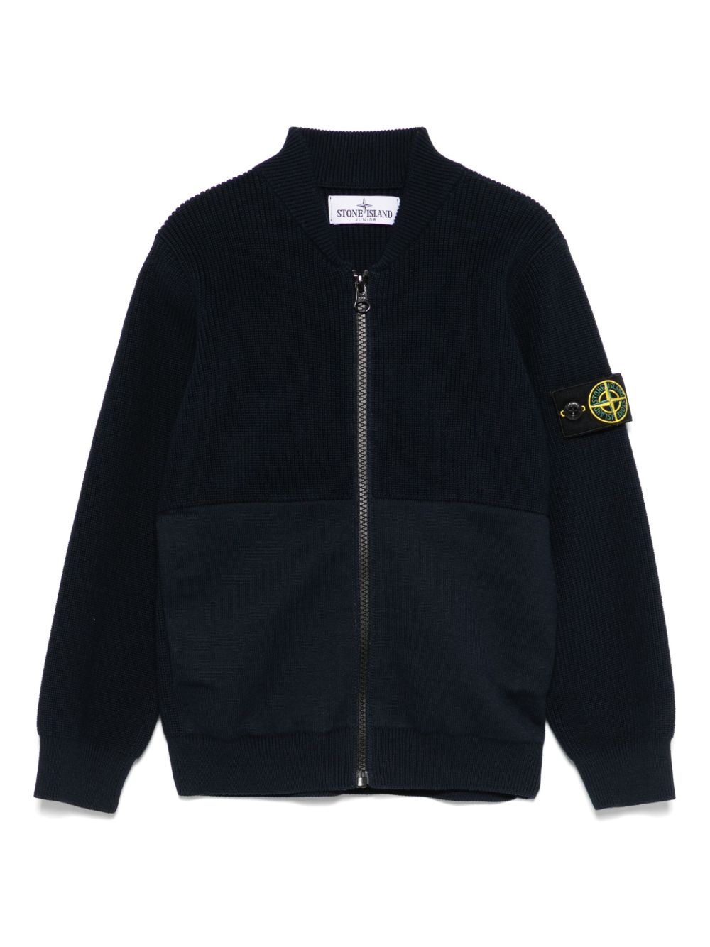 chiusura frontale con cerniera blu navy, due tasche laterali inserite, colletto da baseball, maniche lunghe