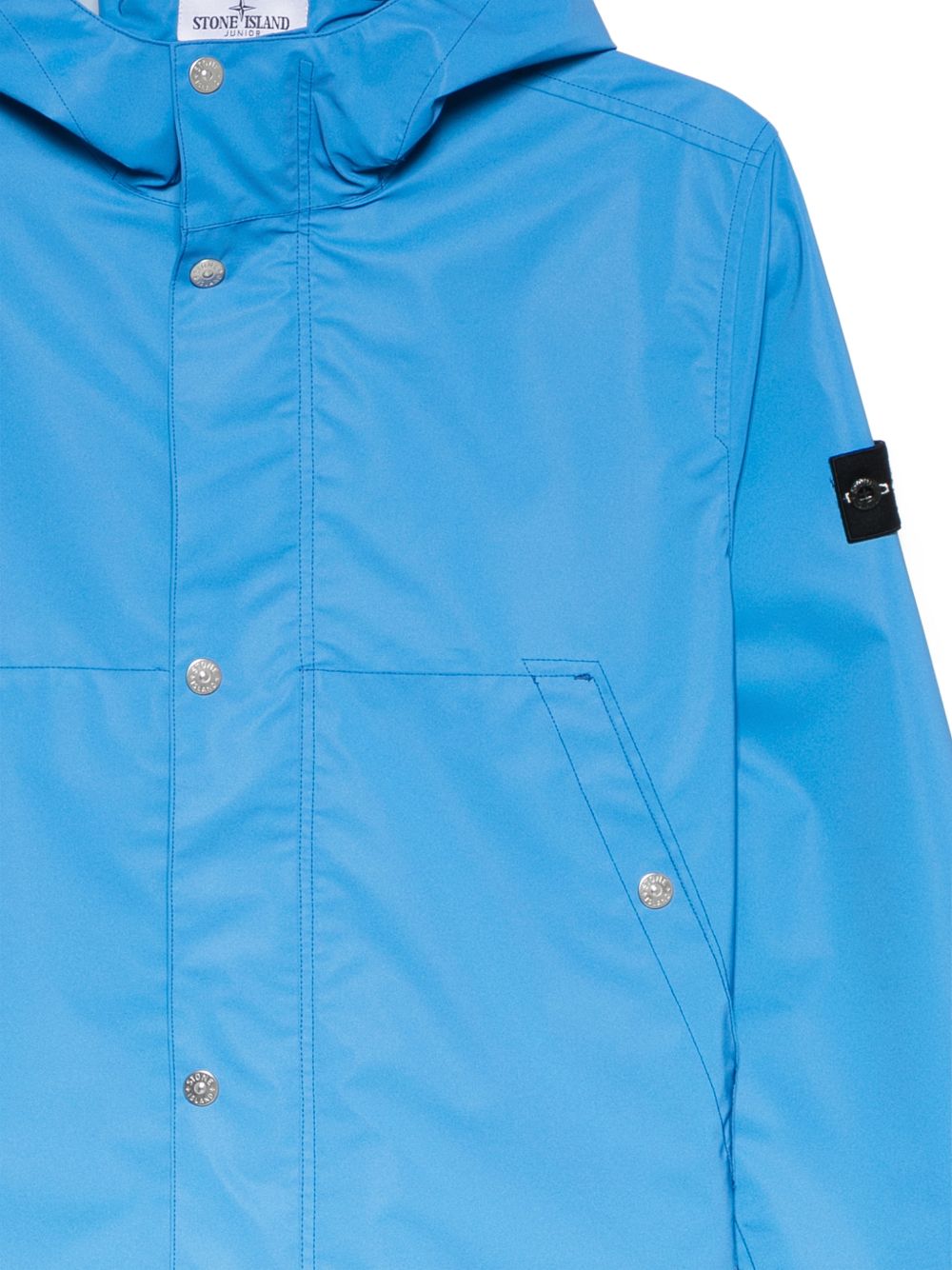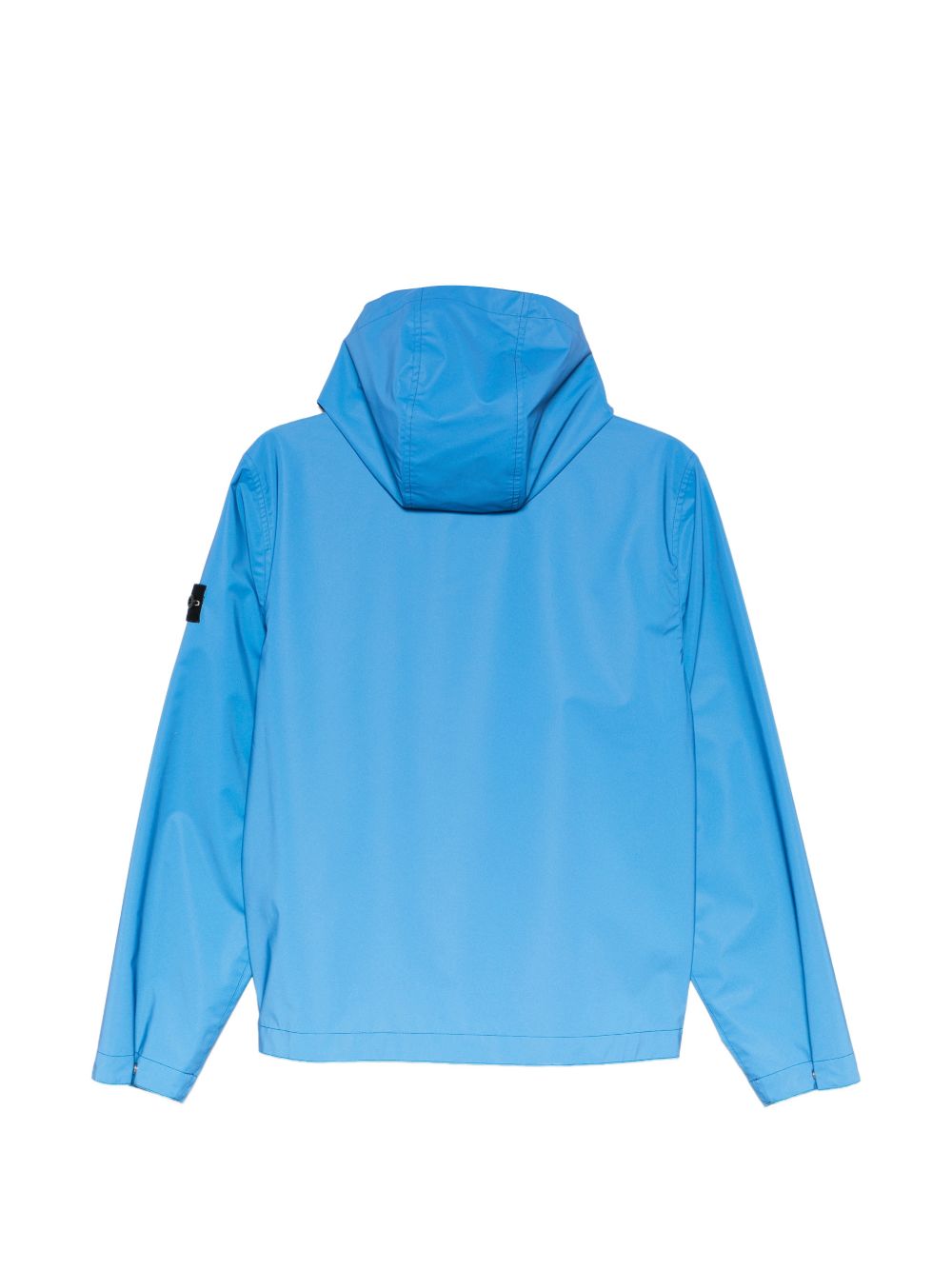 blu con cappuccio, chiusura con bottoni a pressione, tasca sul petto, maniche lunghe, patch con logo