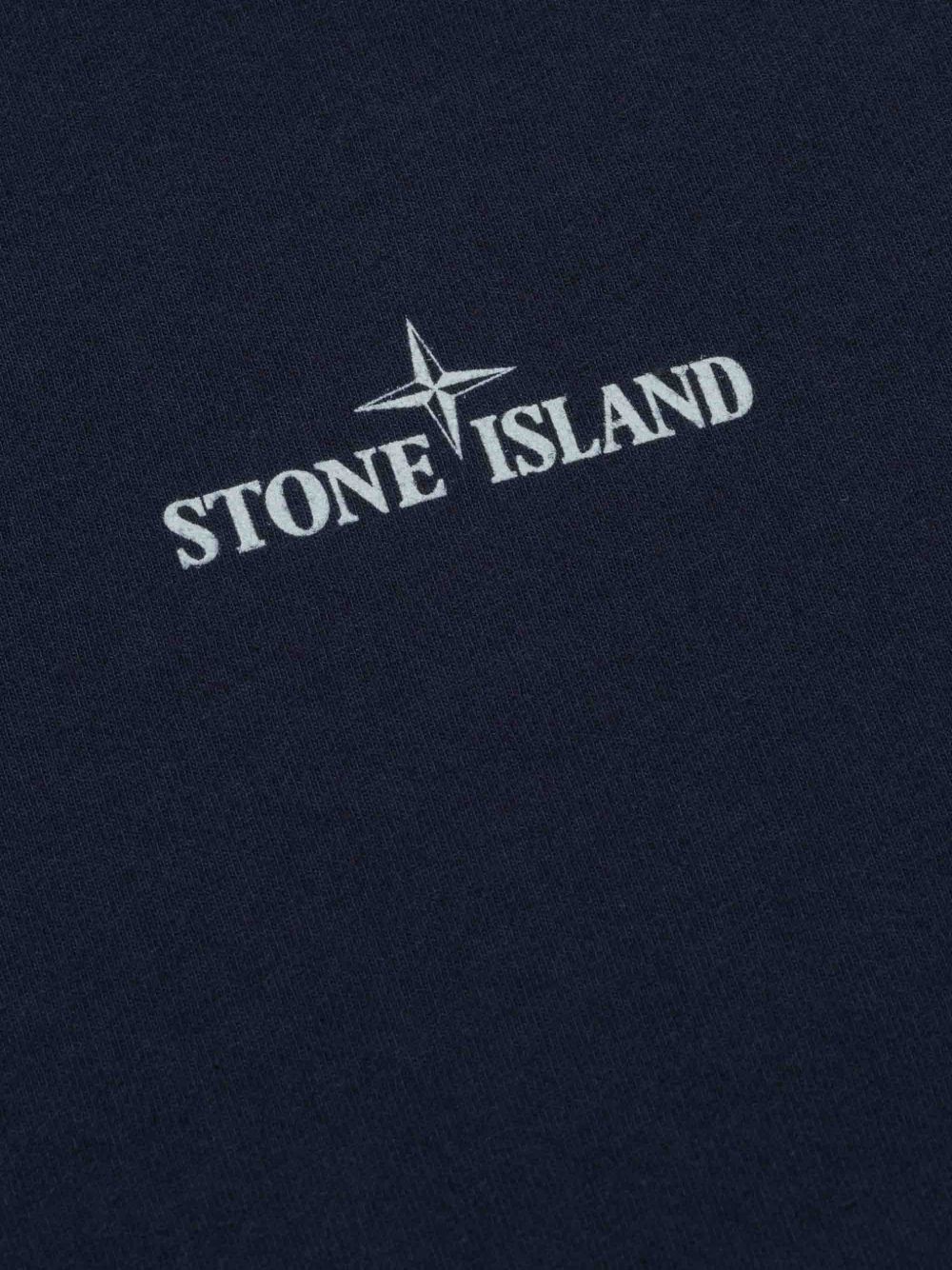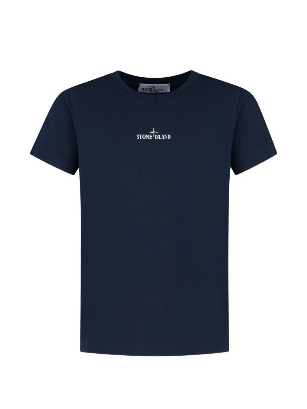 T-shirt blu navy con texture e logo stampato, girocollo, maniche corte, orlo dritto