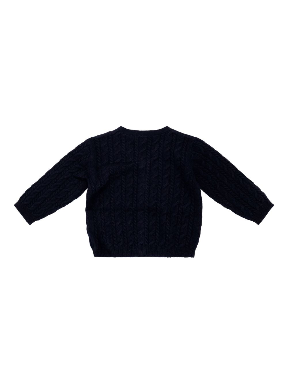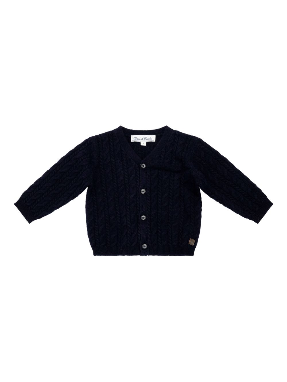 Cardigan a trecce blu scuro, scollo a V, chiusura frontale con bottoni, maniche lunghe