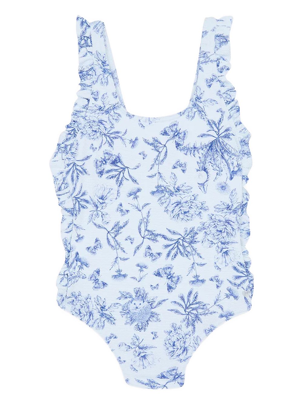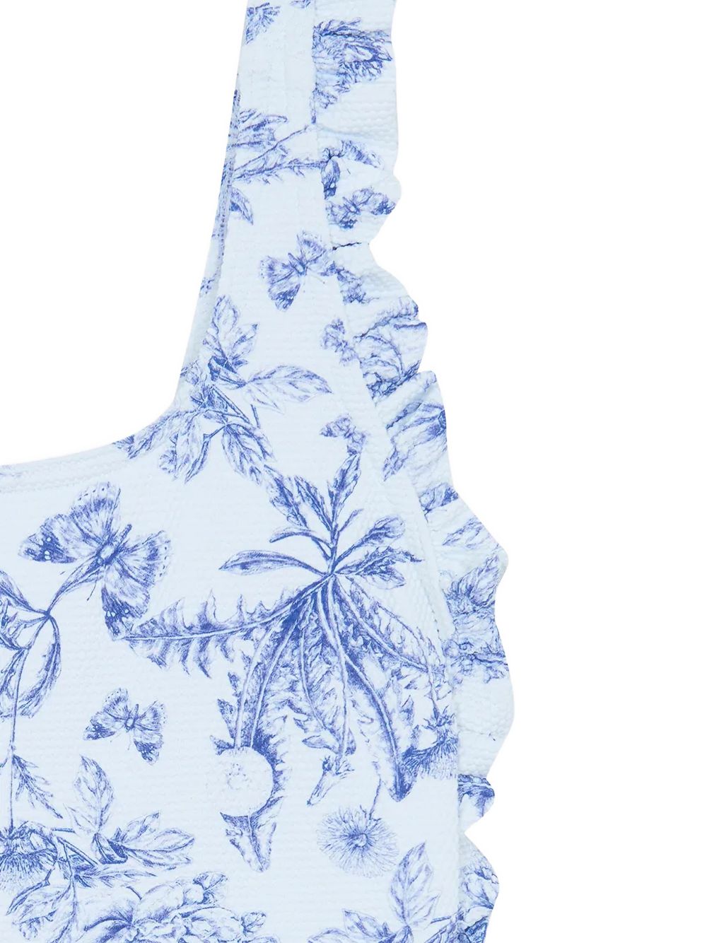 Costume biancoblu, stampa floreale, bordatura arricciata, scollo rotondo, schienale basso.