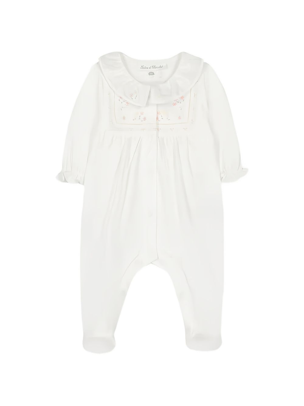 Tutina con colletto a balze color crema, stampa floreale, chiusura con bottoni, maniche lunghe, piedi chiusi